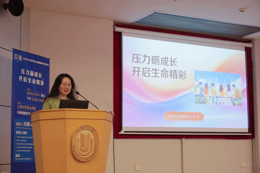 11 月 14 日下午,“压力砺成长,开启生命精彩” 主题心理健康讲座在行政楼报告厅开展。上海大学心理辅导中心主任许静博士作为主讲人,从认知、情绪、价值等多维度引导学生构建积极健康的心理防御与成长体系,帮助学子在快节奏的学业与生活中找到平衡与力量,近两百名学生踊跃参与。