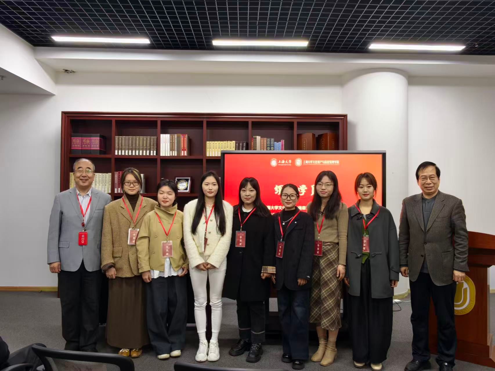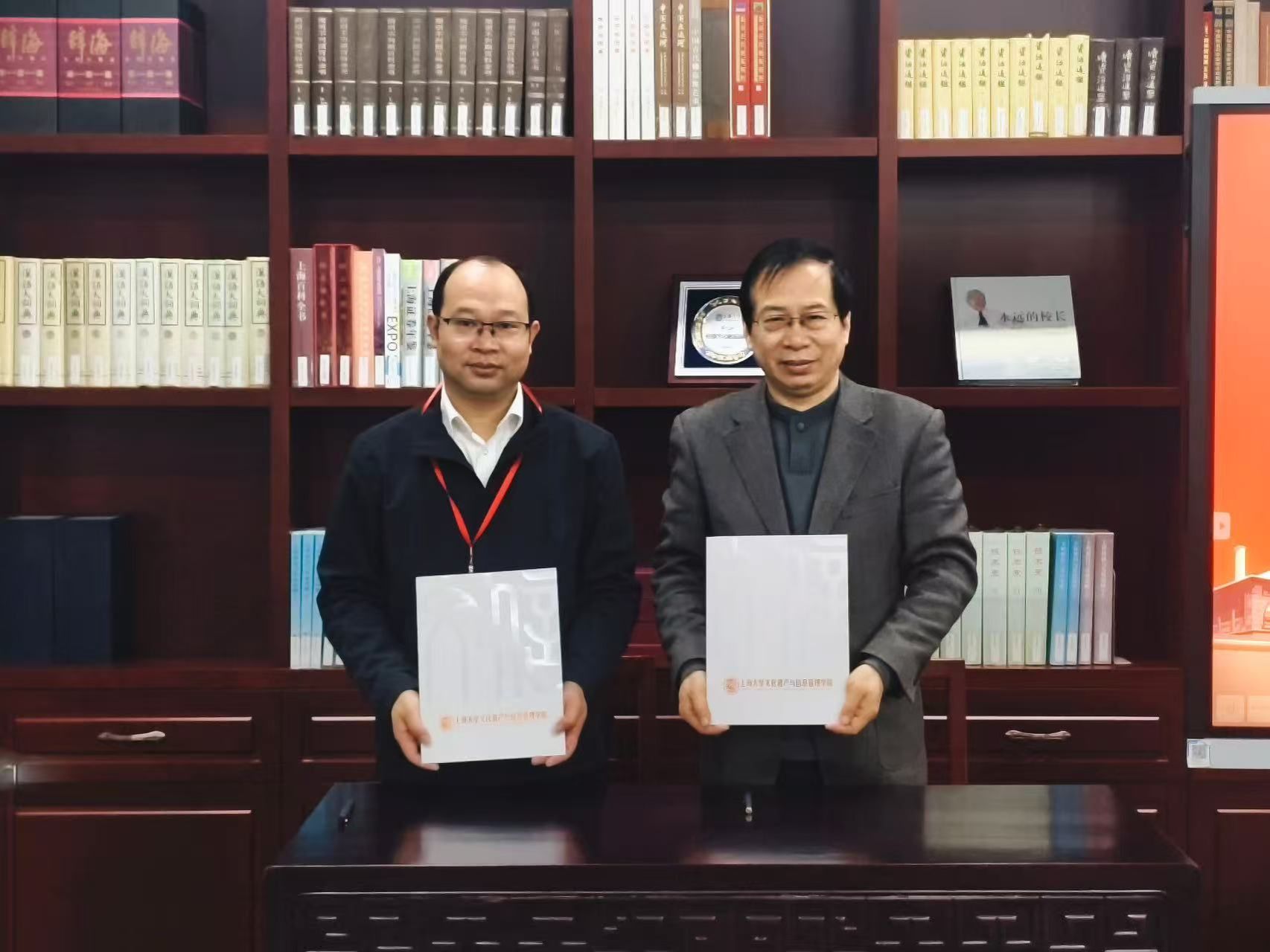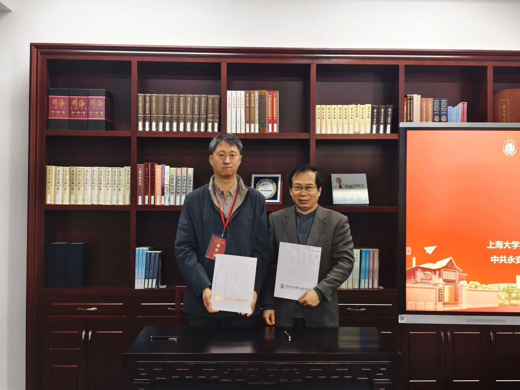 上海大学文化遗产与信息管理学院院长马萧林与上海大学伟长学者、文化遗产保护基础科学研究院院长黄继忠共同为永安市讲解员颁发学习证书。