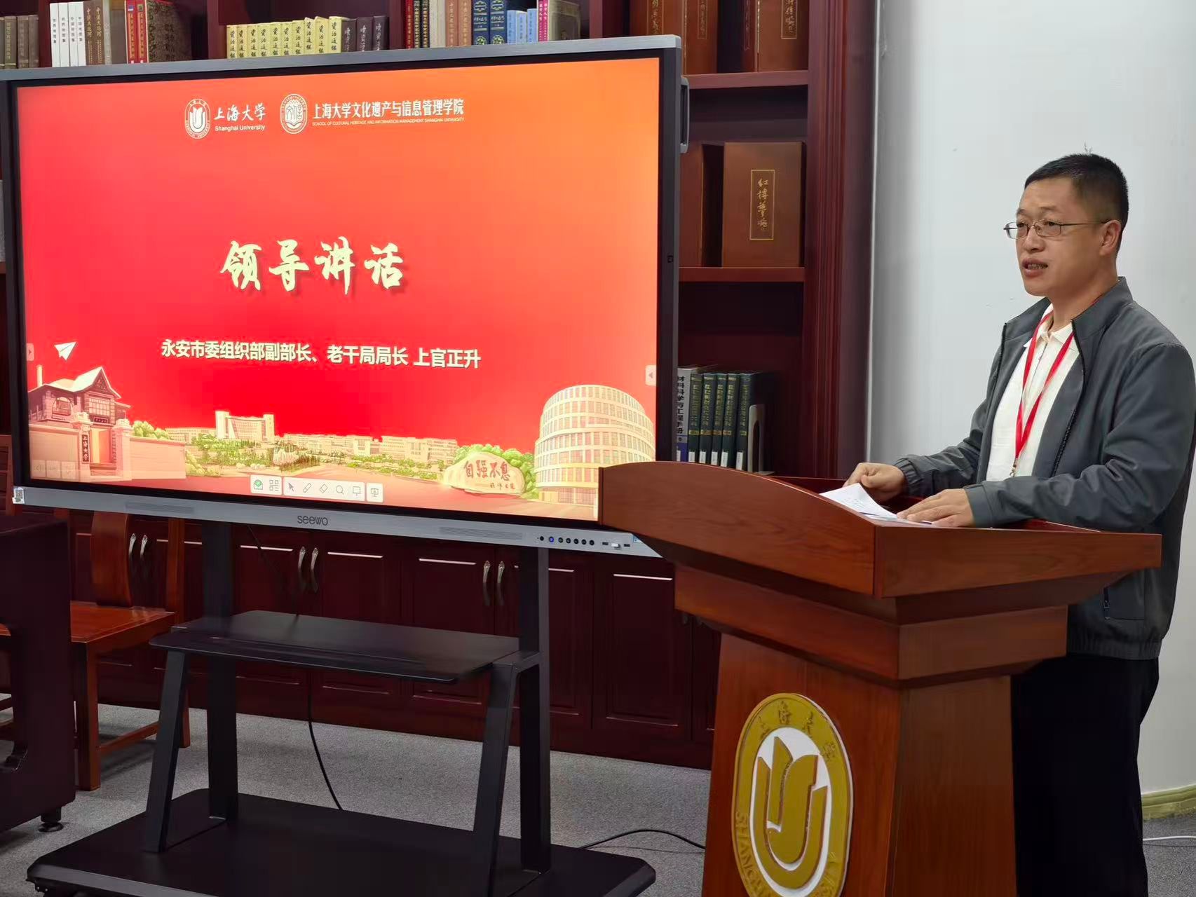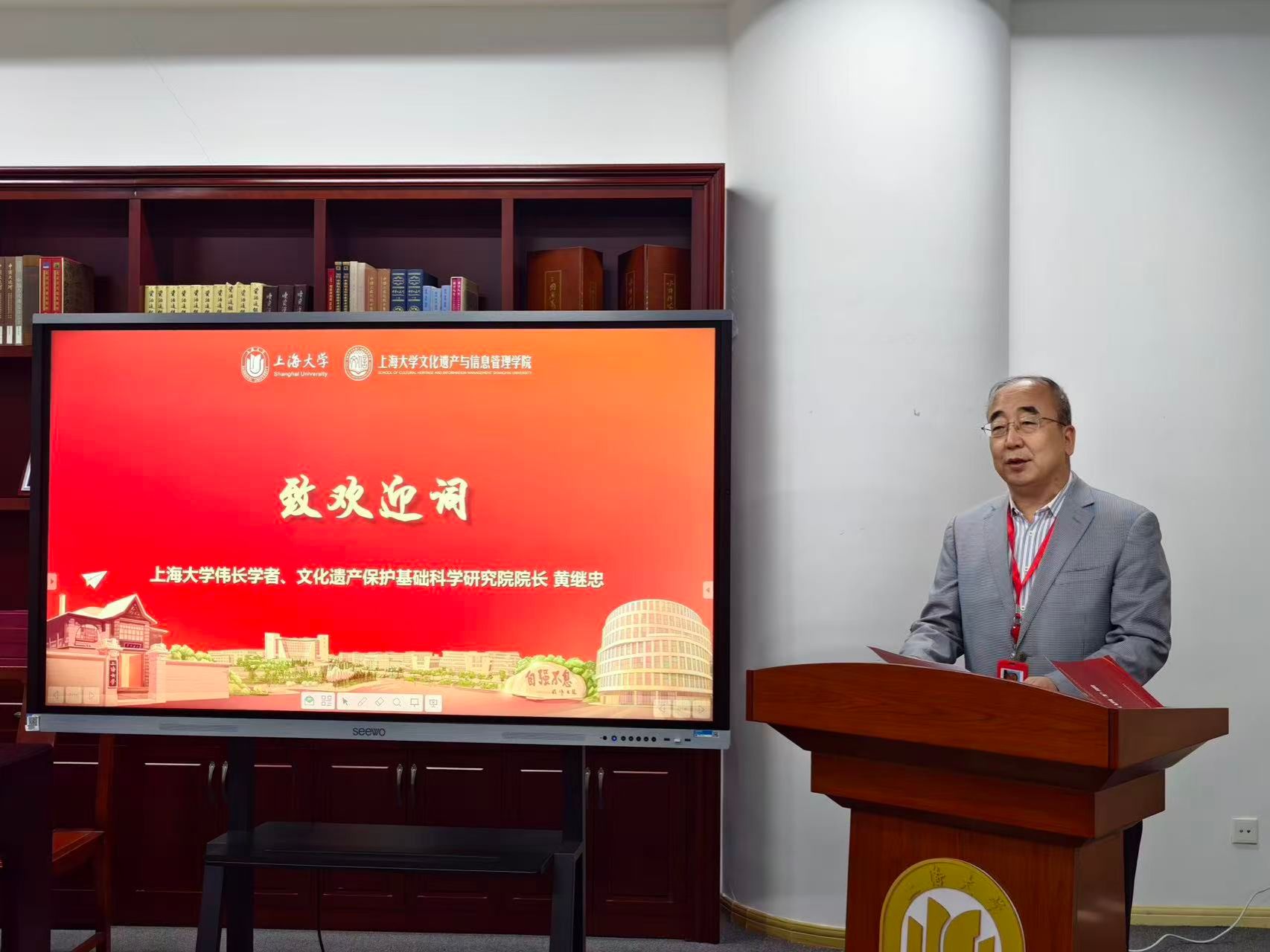 上海大学伟长学者、文化遗产保护基础科学研究院院长黄继忠致欢迎词。他对远道而来的永安各位同仁表示热烈欢迎。他表示,上海大学文化遗产与信息管理学院汇聚了考古、文保、档案等多学科优势,依托国家级平台在革命文物保护与活化利用领域形成了鲜明特色。前期学院已与永安市相关单位奠定了良好合作基础,此次活动的举办既是将校地合作共识落地落实的重要举措,也是以高校智力资源服务地方红色文化发展的具体行动,期待双方以此次活动为契机,共同推动红色文化遗产的保护研究与传承创新。