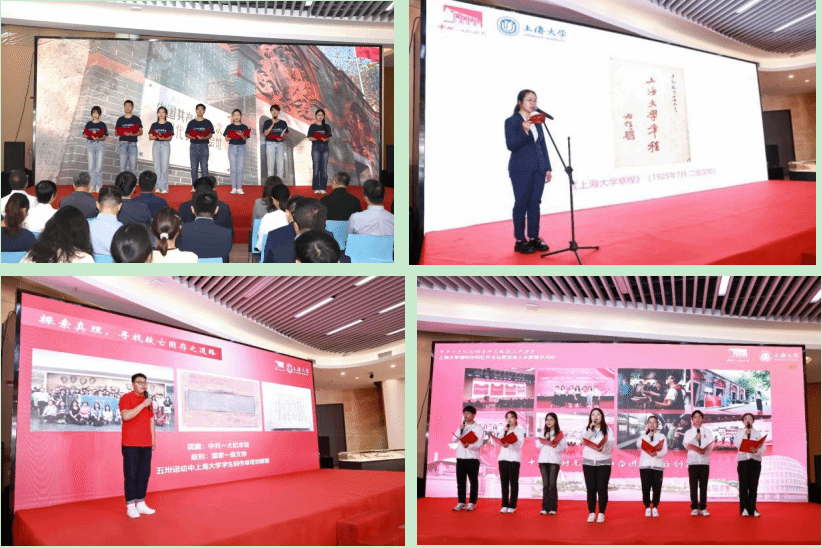 新闻传播学院学生代表带来诗歌朗诵《百年求索,中国青年这样说》。中共一大纪念馆藏品保管部保管专员贾怡萍介绍“百物进百校”系列活动中进入上海大学现场展陈的16件与上海大学发展历史息息相关的珍贵革命文物。文化遗产与信息管理学院研究生李薪宇带来一堂主题为《从党的诞生地出发:在百年红色学府践行伟大建党精神》的红色文化思政育人微课程。上海大学“萤火之光”志愿服务队讲述在中共一大纪念馆十二年追梦、逐梦、筑梦的故事,中共一大纪念馆党委委员、副馆长阮竣为同学们出征授旗。文化遗产与信息管理学院研究生辅导员张玉昭领誓,上大青年将坚韧奋发,勇毅笃行,谱写中共一大纪念馆志愿服务新篇章。