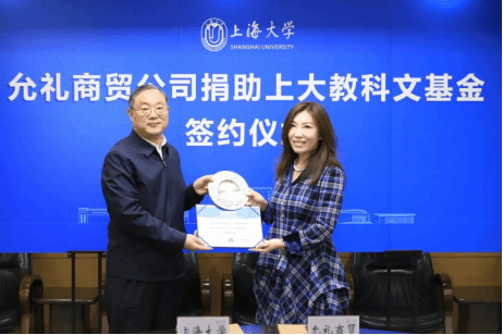 沈安琪女士和段勇副书记分别代表上海允礼商贸有限公司和上海大学签订捐赠协议,双方与会领导见证。根据协议规定,此次捐赠将用于支持上海大学学生培养、学科发展,以及支持设立上大教科文基金。