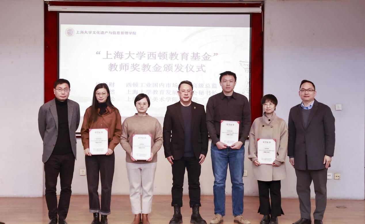 西顿工业国内市场系统高级总监徐长财,上海大学对外联络处处长、教育发展基金会秘书长陈然,上海美术学院副院长王海松为获奖教师颁奖并合影留念。