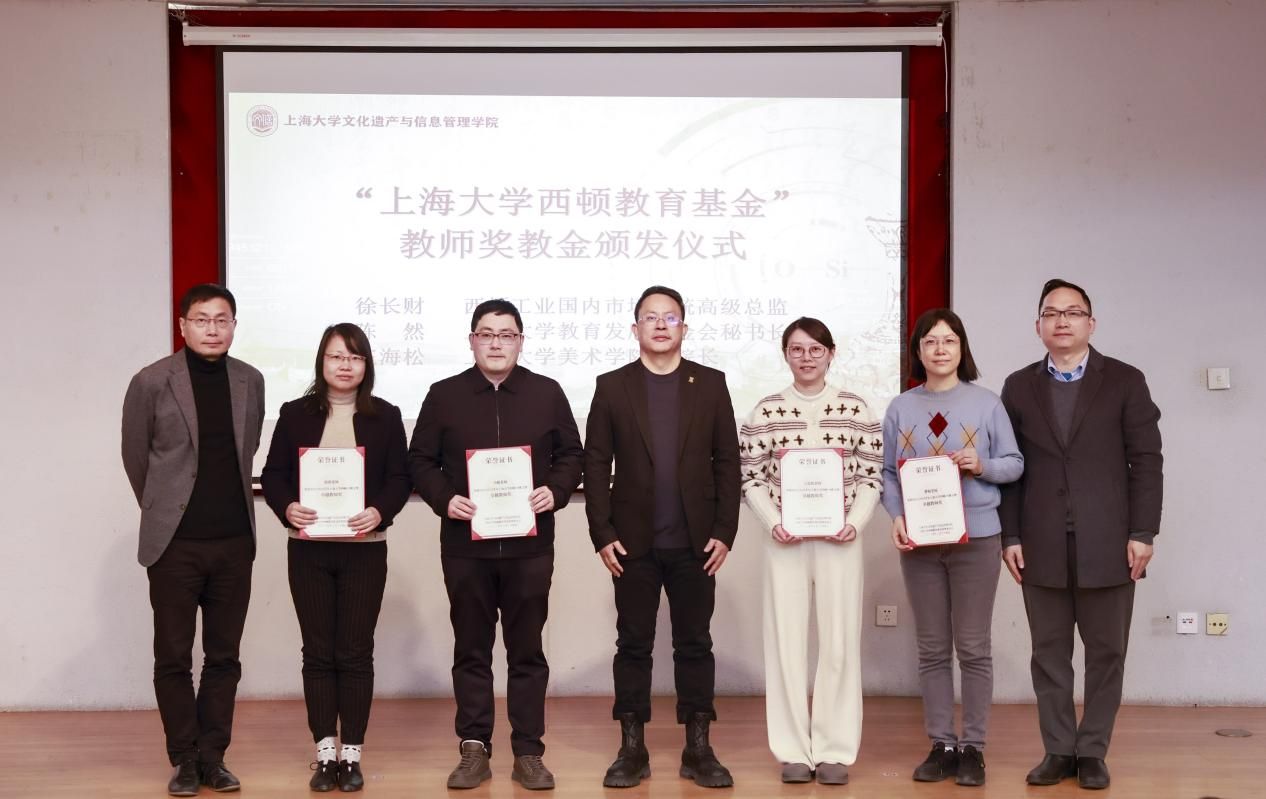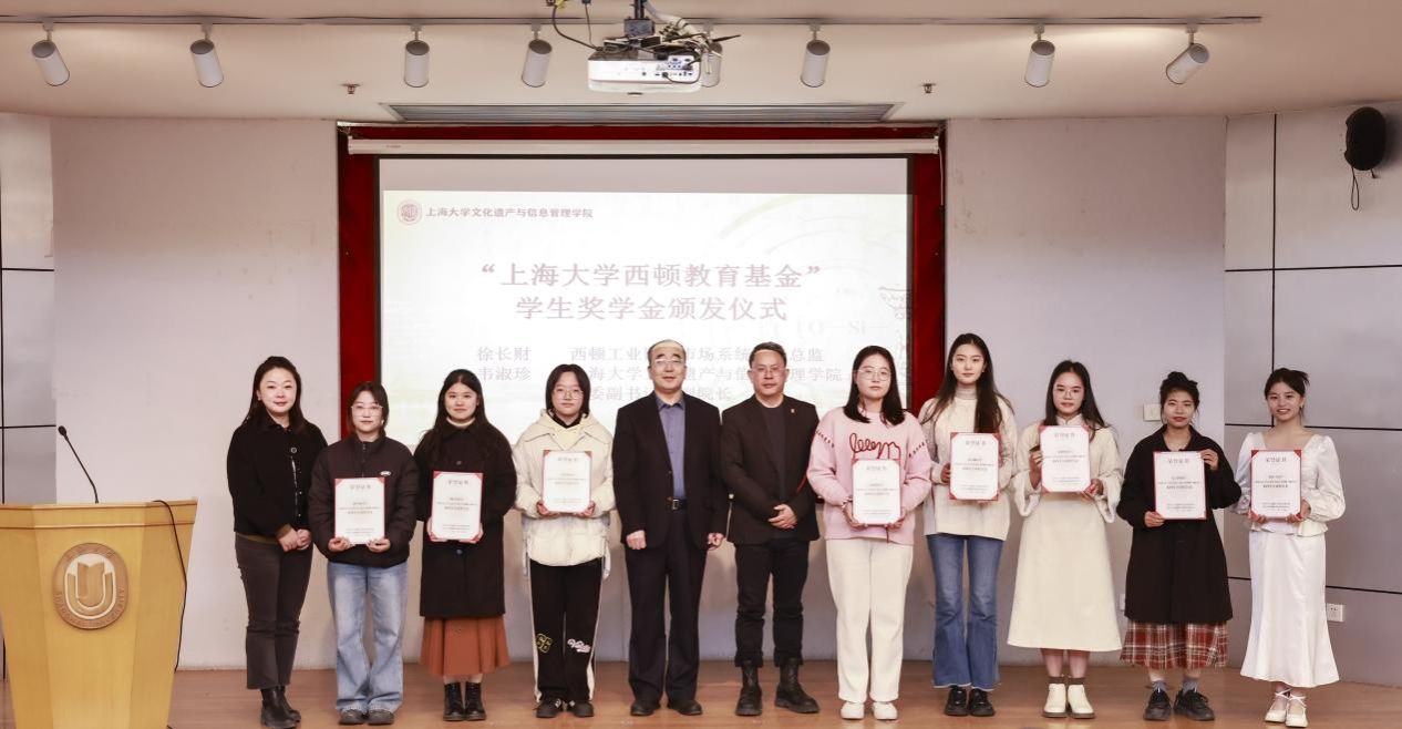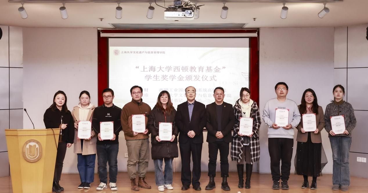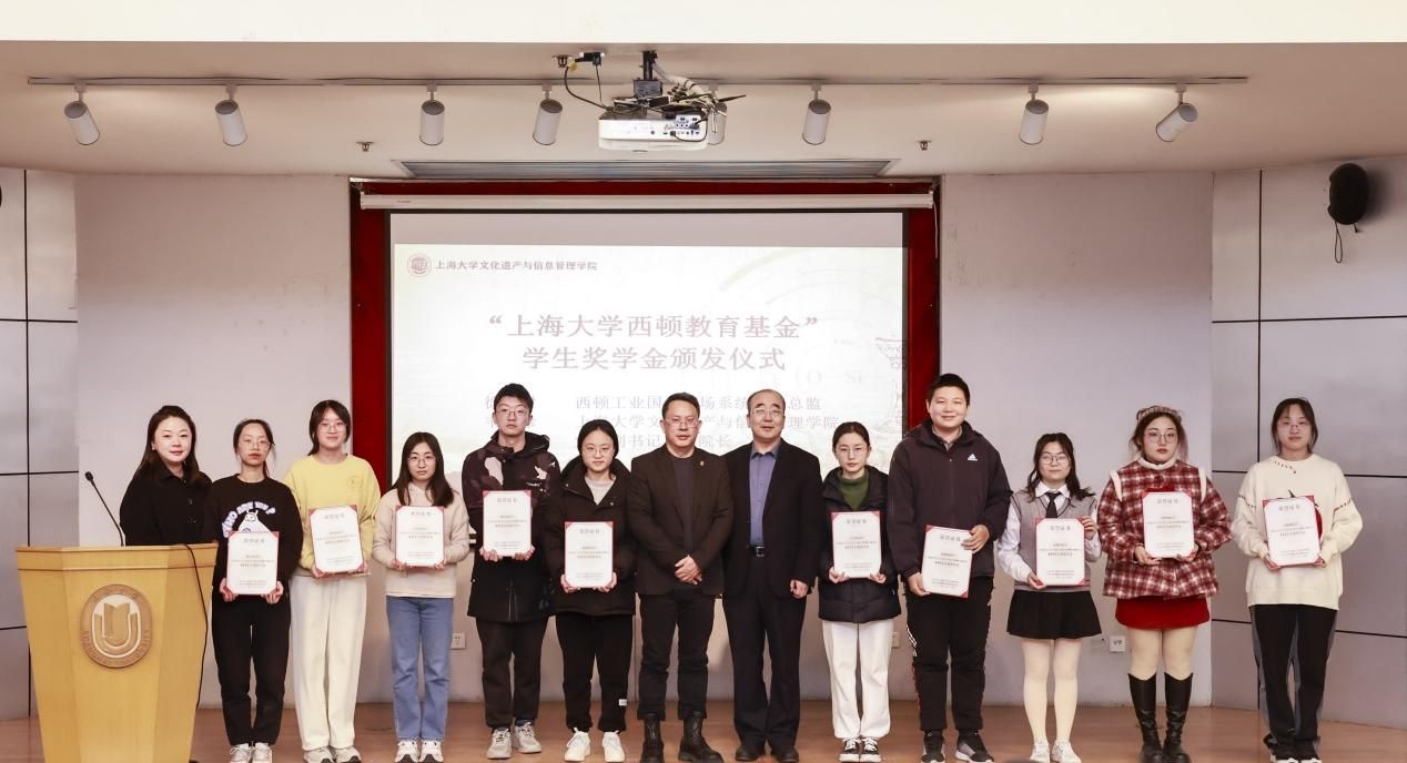 西顿工业国内市场系统高级总监徐长财,上海大学文化遗产与信息管理学院院长黄继忠,学院党委副书记、副院长韦淑珍为获奖学生颁奖并合影留念。